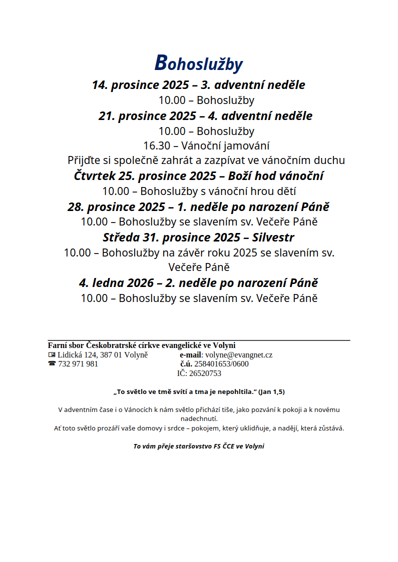 Srdečně vás zveme na bohoslužby v Českobratrské církvi evangelické ve Volyni.